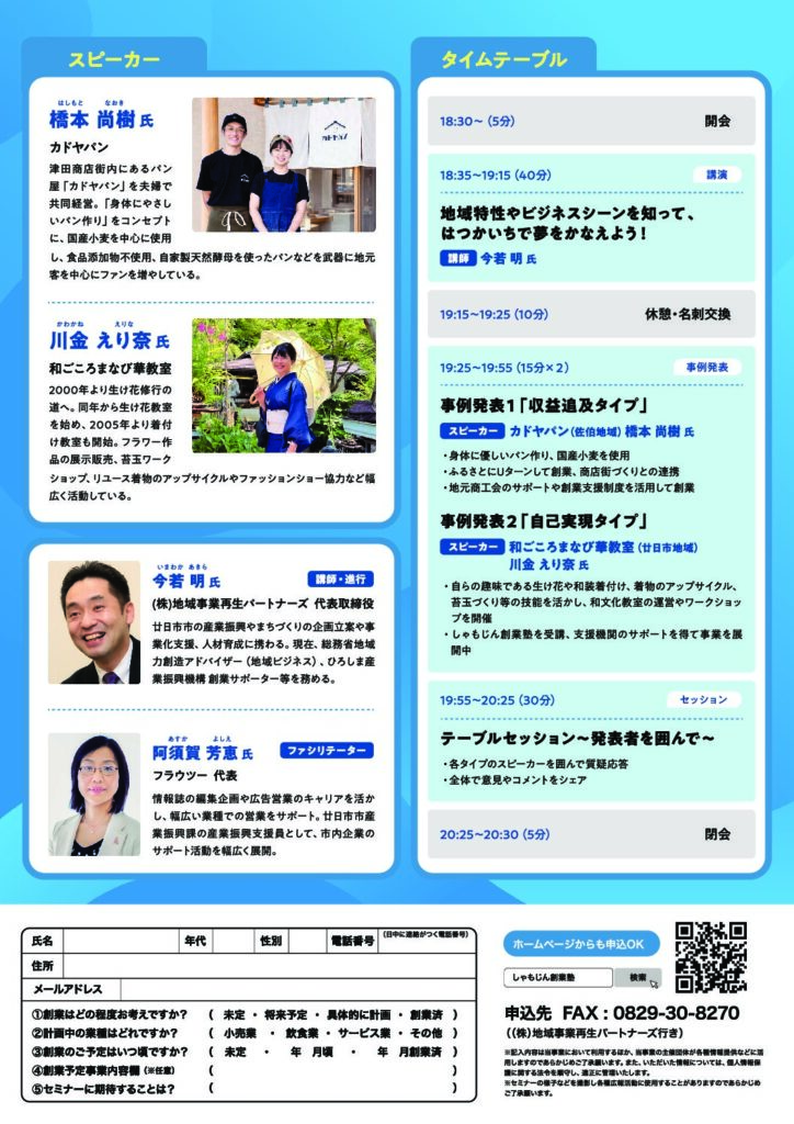 廿日市市で創業を考えている方、何かを始めようと考えている方等にお勧めします! プログラムは、(1)講師 今若明による講演「地域特性やビジネスシーンを知って、はつかいちで夢をかなえよう!」 (2)事例発表(2例)①「収益追及タイプ」カドヤパン 様(佐伯地域)、②「自己実現タイプ」和ごころまなび華教室 様(廿日市地域)、(3)テーブルセッション~発表者を囲んで~、ファシリテーターは、フラウツー 代表 阿須賀芳恵 氏です。