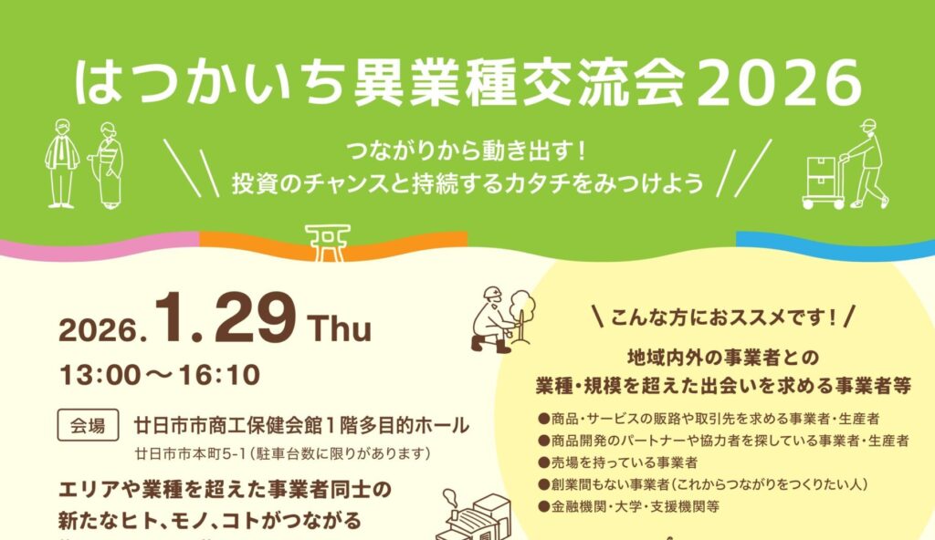 テ ー マ はつかいちの地域特性とビジネスシーンを知ろう 開催日時 2026年2月9日(月) 18時30分~20時30分 会 場 廿日市市商工保健会館1階多目的ホール(廿日市市本町5-1) 主 催 廿日市市産 …